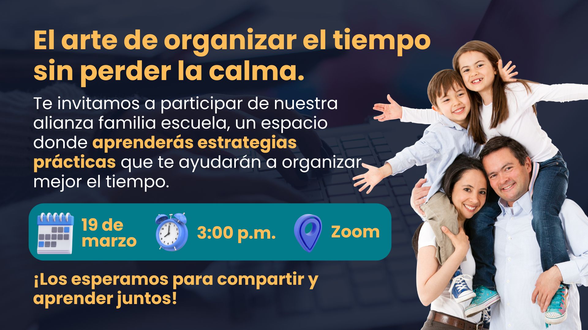 Te invitamos a participar en nuestra Escuela de Padres y Madres el próximo 19 de marzo a las 3:00 p.m., un espacio pensado para compartir estrategias prácticas que ayuden a organizar mejor el tiempo y acompañar el proceso educativo de los estudiantes con mayor tranquilidad y equilibrio.