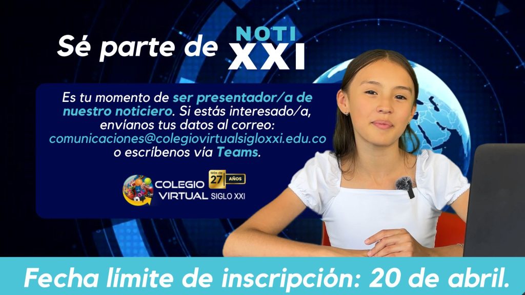 Hoy queremos invitarte a dar un paso al frente y vivir una experiencia diferente. Buscamos un niño y una niña que quieran convertirse en las nuevas voces de Noti XXI. Si te gusta comunicar, este es tu momento. Envíanos tus datos al correo comunicaciones@colegiovirtualsigloxxi.edu.co o escríbenos por Teams.