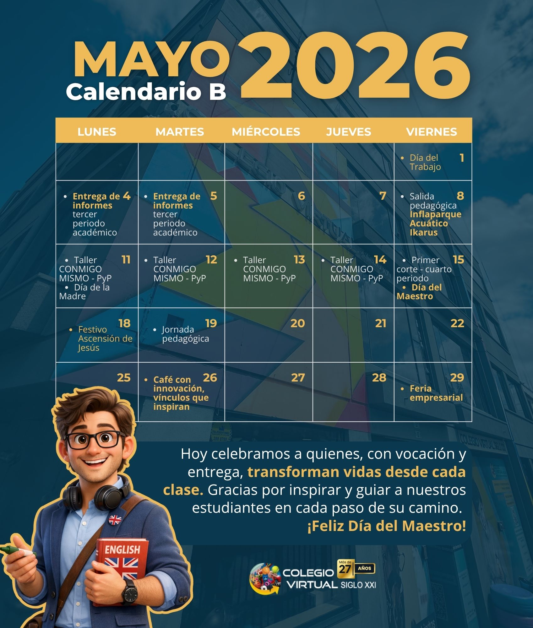 Un nuevo mes comienza y con él llegan retos, aprendizajes y metas por cumplir. Mayo es una invitación a seguir avanzando con constancia, organización y actitud positiva. Cada espacio académico es una oportunidad para crecer. Prepárate, planifica y aprovecha al máximo cada momento de tu proceso educativo. Estamos contigo en cada paso.